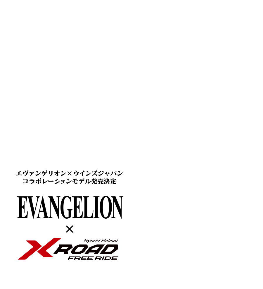 エヴァンゲリオン×ウインズジャパン コラボレーションヘルメット 『X-ROAD FREE RIDE エヴァンゲリオン エディション』 X-ROAD FREE RIDEエヴァンゲリオン エディション 01.パープル エヴァンゲリオン初号機をモチーフにしたモデルです。 価格:32,780円(消費税10%込み・税抜29,800円) サイズ:M / L / XL X-ROAD FREE RIDEエヴァンゲリオン エディション 02.レッド エヴァンゲリオン2号機・アスカ プラグスーツをモチーフにしたモデルです。 価格:32,780円(消費税10%込み・税抜29,800円) サイズ:M / L / XL X-ROAD FREE RIDEエヴァンゲリオン エディション 00.ホワイト エヴァンゲリオン零号機・綾波レイ プラグスーツをモチーフにしたモデルです。 価格:32,780円(消費税10%込み・税抜29,800円) サイズ:M / L / XL X-ROAD FREE RIDE 詳細はこちら