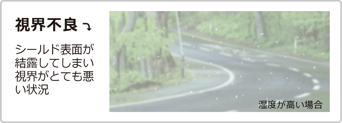安全走行に必要なことのひとつに「視界の確保」が欠かせません。視界が悪ければ走行中の危険を見逃すことになり身を危険にさらす恐れも。その危険因子としてシールド内の曇りも例外ではありません。