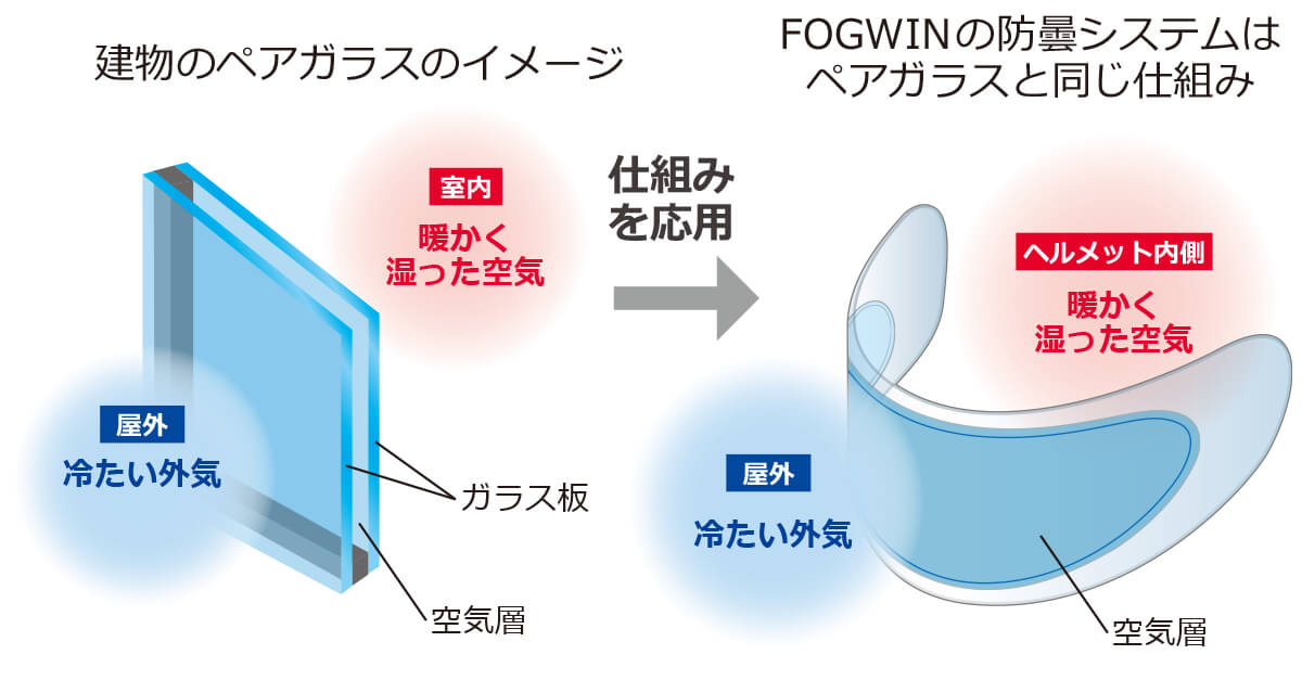 FOGWINの防曇システムは、建物のペアガラスと同様のしくみで、シールドと防曇レンズの間に空気層を作り、寒暖差を抑えることで曇りを防いでいます。