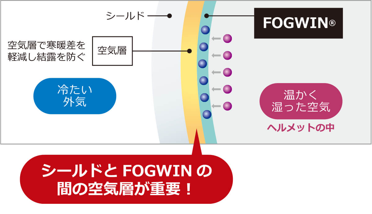 シールドとFOGWIN(防曇レンズ)の間に空気層があるから、ヘルメットの外と中の寒暖差を軽減し、結露を防ぐことができます。