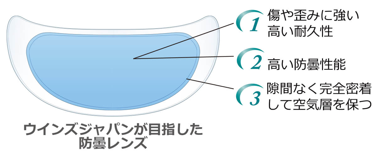 ウインズジャパンは、バイクで安全に走行する上で「シールドが曇らない」ということを、とても重要なポイントと考え、シールドが曇らない防曇レンズを開発しました。