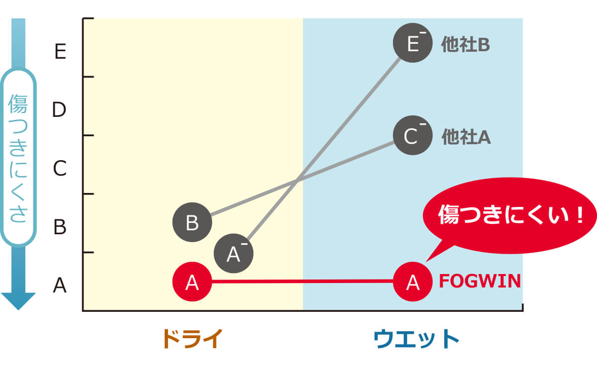 ドライ状態はもちろん、摩擦抵抗が大きくなるウエット状態でも傷がつきにくいことが分かります。