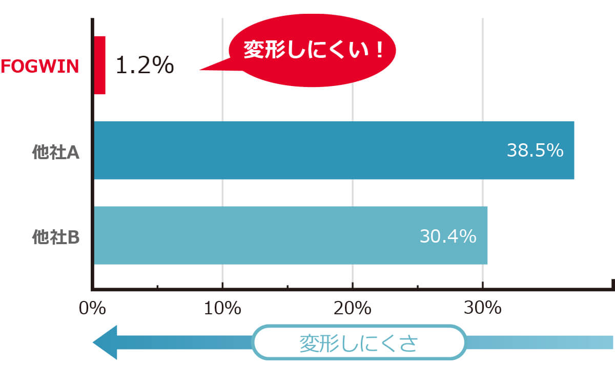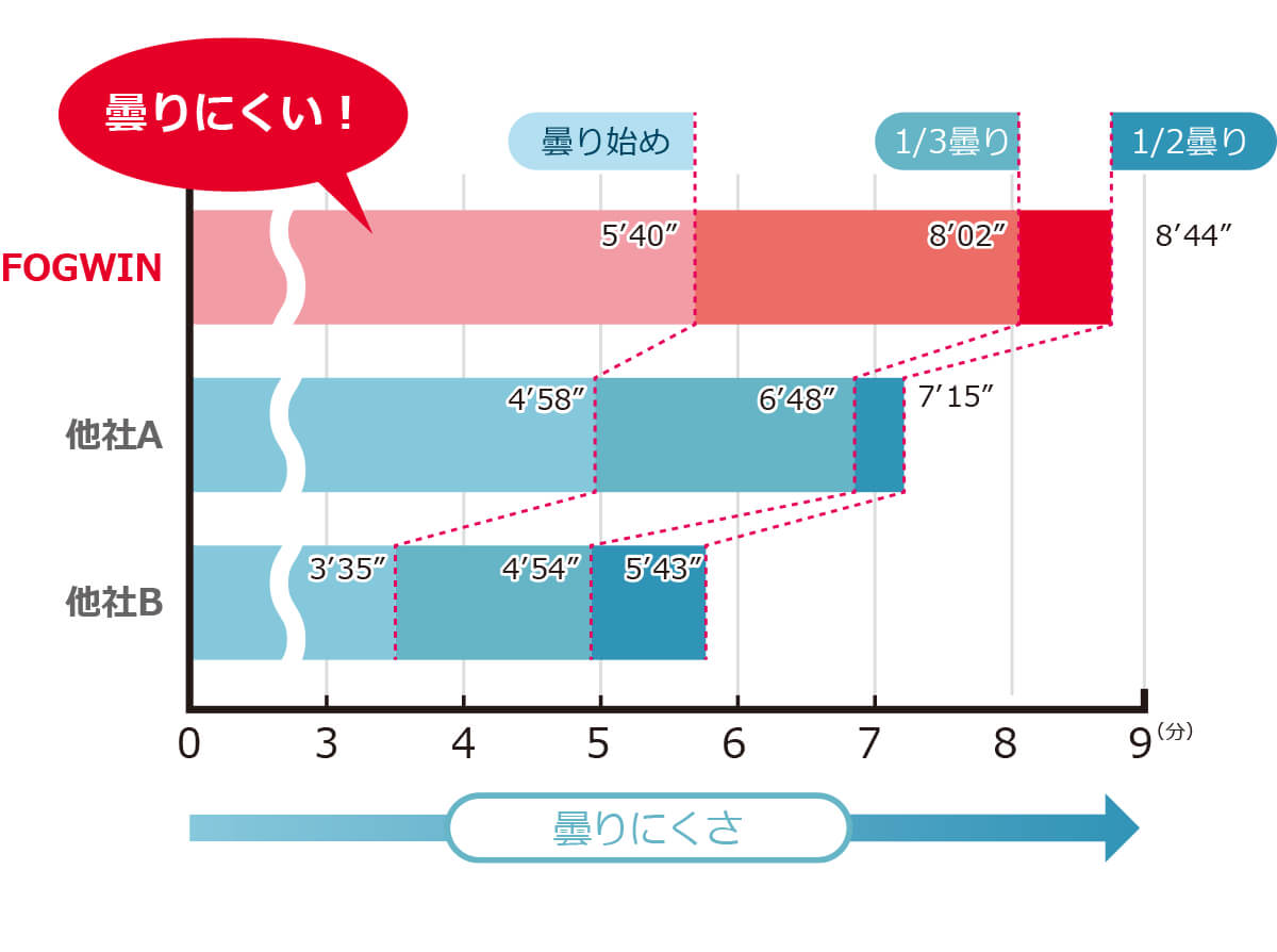 この実験により、FOGWINはその他製品に比べ曇りにくいことが分かります。