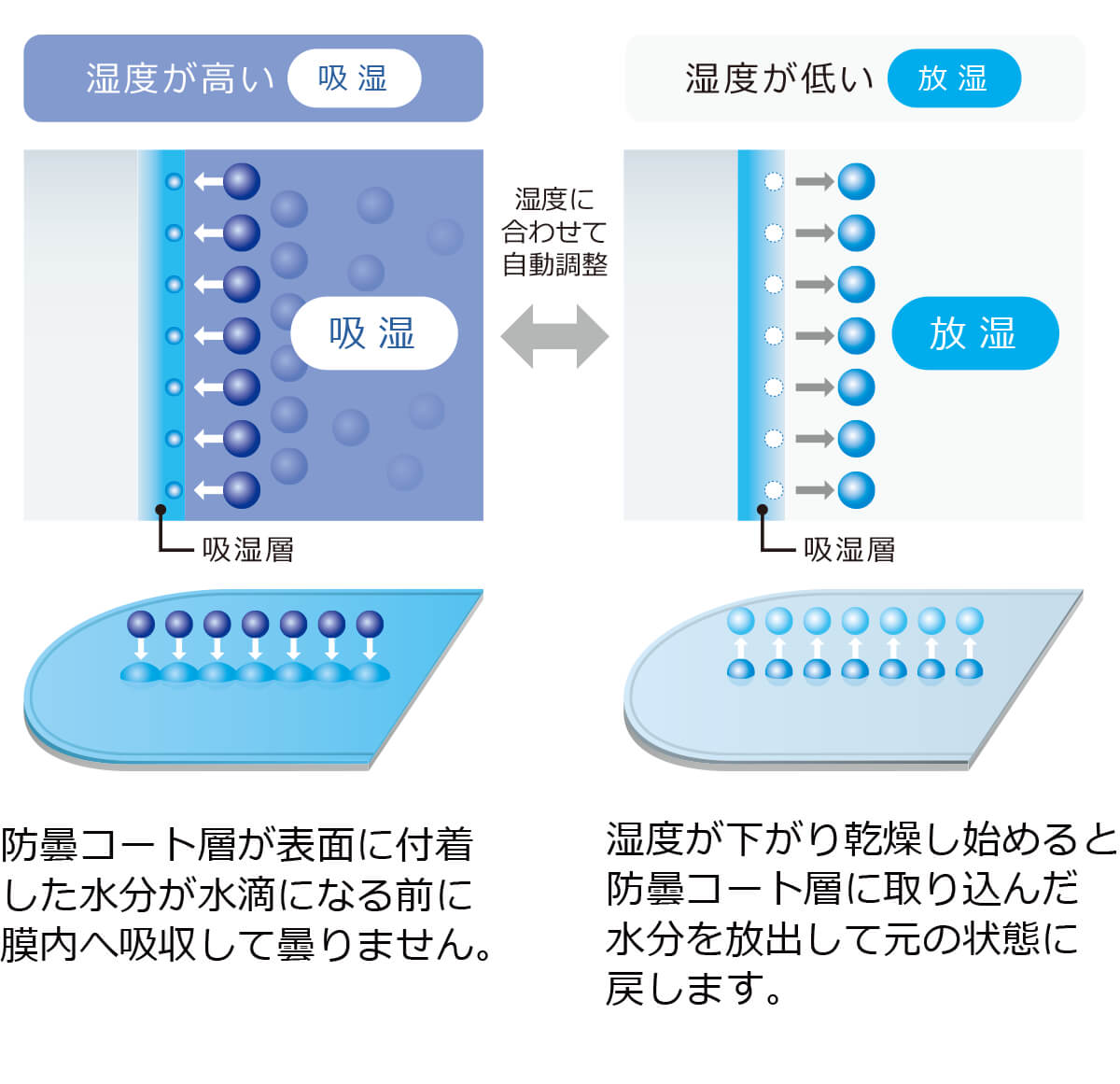 吸水性のある特殊素材のレンズが湿度に応じて吸湿・放湿をくり返し、ヘルメット内部側だけでなく空気層側も同時に曇りを防ぎます。