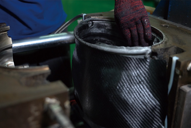 独自製法PPVAを用い、帽体の内部からはエアーバッグ法で加圧、外部からは真空引き法にて減圧しながら、あらかじめ積層されたプリプレグシートを真空状態に近づけ、不要な樹脂や気泡を極限まで取り除きながら加熱して硬化させています。この製法によって軽量かつ高強度、高耐久性を兼ね備えた帽体ができるのです。