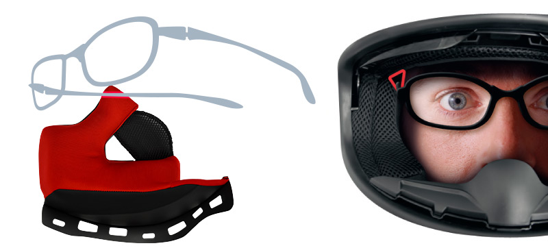 チークパッド上端部のメガネのツルがあたる部分をスポンジの形状で空間に余裕を持たせることで、メガネのツルによる圧迫を軽減しました。