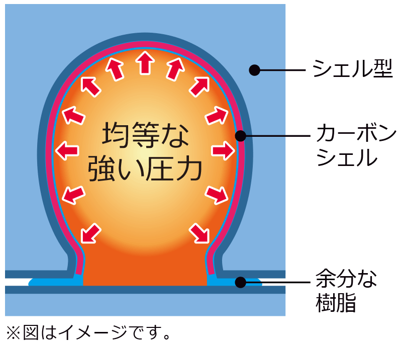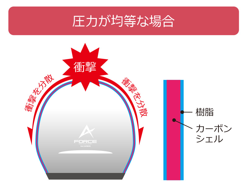 ドライカーボンシェルは、プレス時に高い圧力を均等に加えて余分な樹脂をシェルに残さず、厚みを安定させることで耐衝撃性と分散性を向上させ、安全性を損なうことなく軽量化させたシェルです。
