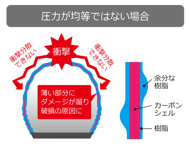 繊維のクロスに樹脂を浸し込み、そのままプレスすると、厚みが出る部分と薄くなる部分ができてしまいます。