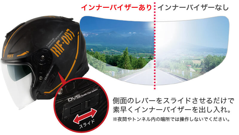 側面のレバーをスライドさせるだけですばやくインナーバイザーを出し入れ。日差しの強いとき、突然の逆光でもサングラスのような効果が得られます。