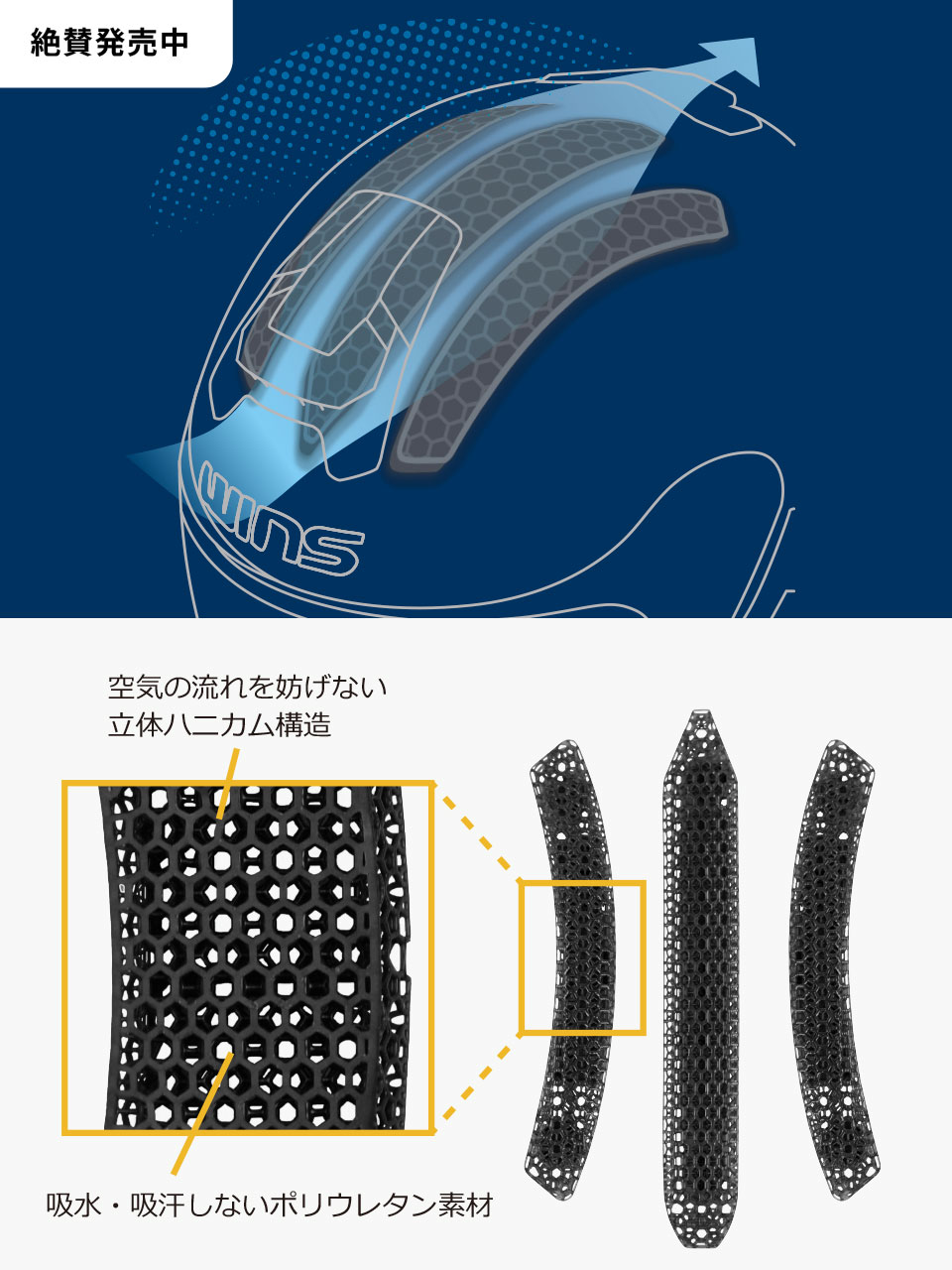 3D Air tech(3Dエアー・テック)は特殊な3Dプリンタで製造したハニカム構造の内装パッドです。 衝撃吸収ライナーに取り付けることでヘルメット内の頭上を空気が通り抜け、走行中頭頂部が蒸にくくなるので夏場の暑い時期は特に快適です。