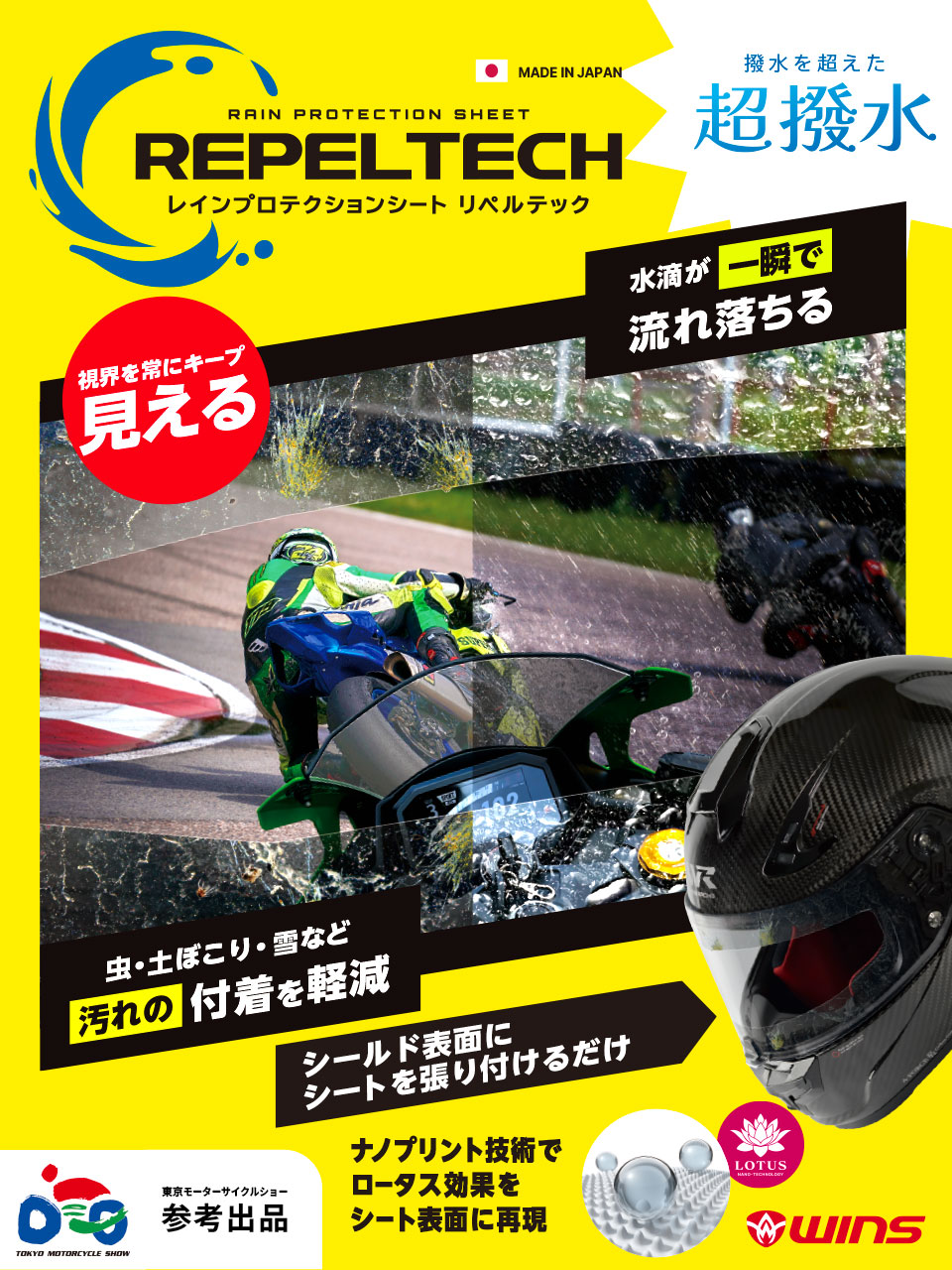 水滴が一瞬で流れ落ちる!汚れも付きにくい!超撥水 レインプロテクションシート『リペルテック』は ヘルメットのシールド表面に貼りつけるだけでシート部分に汚れが付きにくくなり、水滴も一瞬で吹き飛んでしまうので走行中の視界を常にキープしてくれます。
