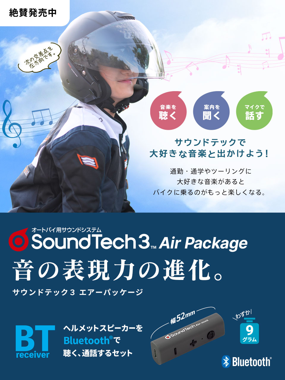 サウンドテック3エアーパッケージは、高音質ヘルメット用スピーカー『サウンドテック3』とわずか9g軽量コンパクトブルートゥースレシーバー『サウンドテック エアー・ミニ』を1つに。マイクも2種類用意し、接続すればハンズフリーにも対応します。