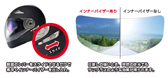 インナーバイザーを装備し、まぶしい日差しをカット。