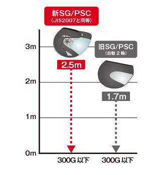 新SG規格の検査基準はJIS2007と同等の高さ2.5mから落とした衝撃が300G以下に抑えられることが条件となる高い安全性が求められる規格です。
